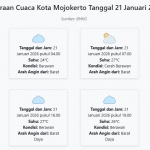 Prakiraan Cuaca Kota Mojokerto Hari ini Rabu, 21 Januari 2026: Suhu 24-32°C, Kecepatan Angin 20 m/s.