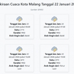 Prakiraan Cuaca Kota Malang Hari ini Kamis, 22 Januari 2026: Suhu 21-30°C, Kecepatan Angin 7.8 m/s.